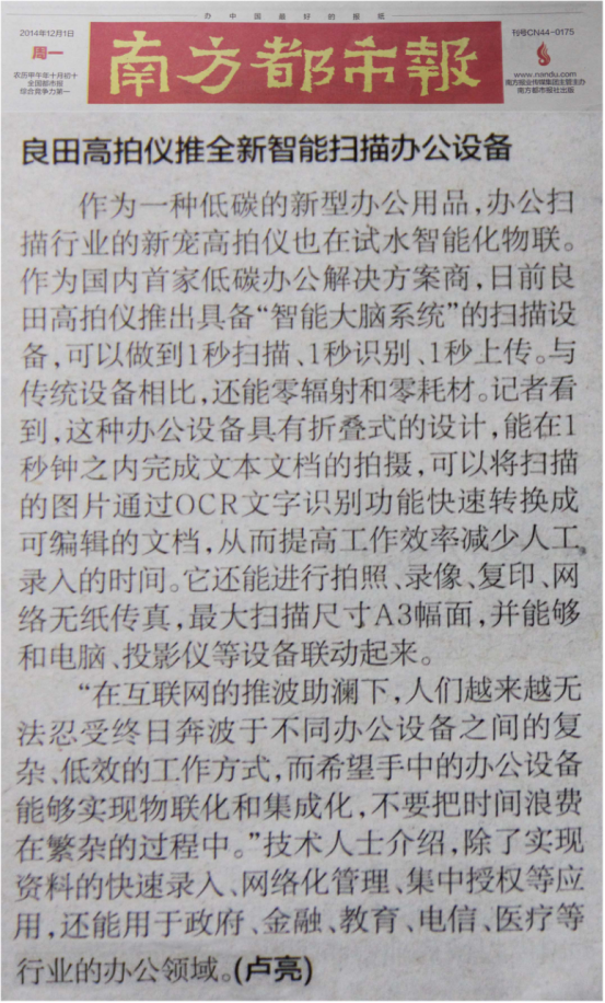 作为一种低碳的新型办公用品,办公扫描行业的新宠高拍仪也在试水智能化物联。作为国内首家低碳办公解决方案商,日前良田高拍仪推出具备“智能大脑系统”的扫描设备,可以做到1秒扫描、1秒识别、1秒上传。与传统设备相比,还能零辐射和零耗材。记者看到,这种办公设备具有折叠式的设计,能在1秒钟之内完成文本文档的拍摄,可以将扫描的图片通过O C R文字识别功能快速转换成可编辑的文档,从而提高工作效率减少人工录入的时间。它还能进行拍照、录像、复印、网络无纸传真,最大扫描尺寸A 3幅面,并能够和电脑、投影仪等设备联动起来。