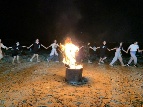 沙滩烧烤BBQ、露天KTV,大家一起围着喝酒、唱歌、聊天烧烤,其乐融融。尽情享受着团建旅行的热情和浪漫。
