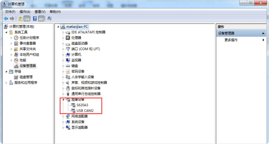 选中“计算机”,鼠标右击打开“管理----设备管理器----图像设备(WIN10为照相机)”,查看设备是否正常识别,被识别后的正常显示如下图: