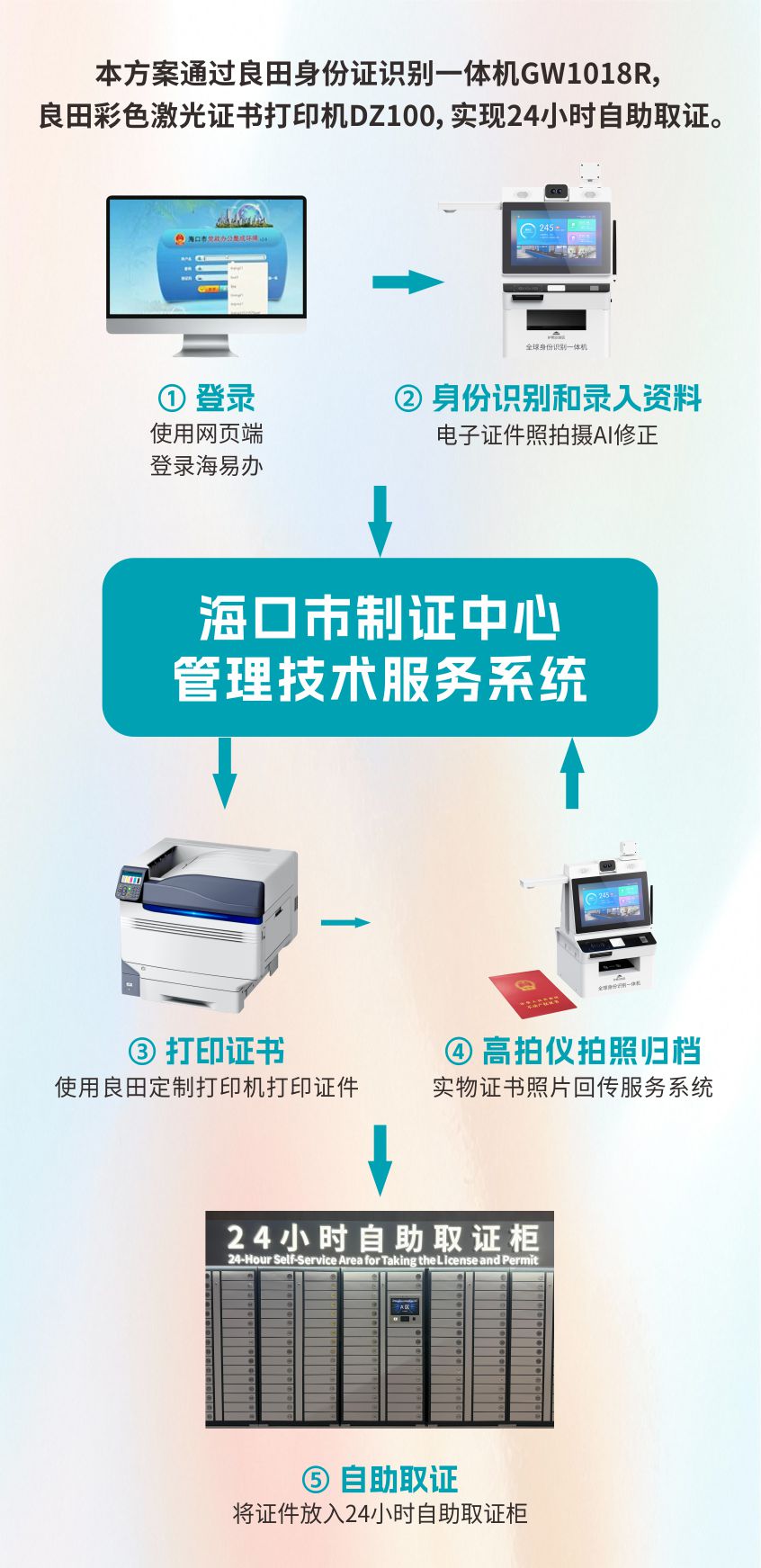 云端处理:依托海口市制证中心管理技术服务系统,实现数据存储、业务逻辑处理及设备监控调度。