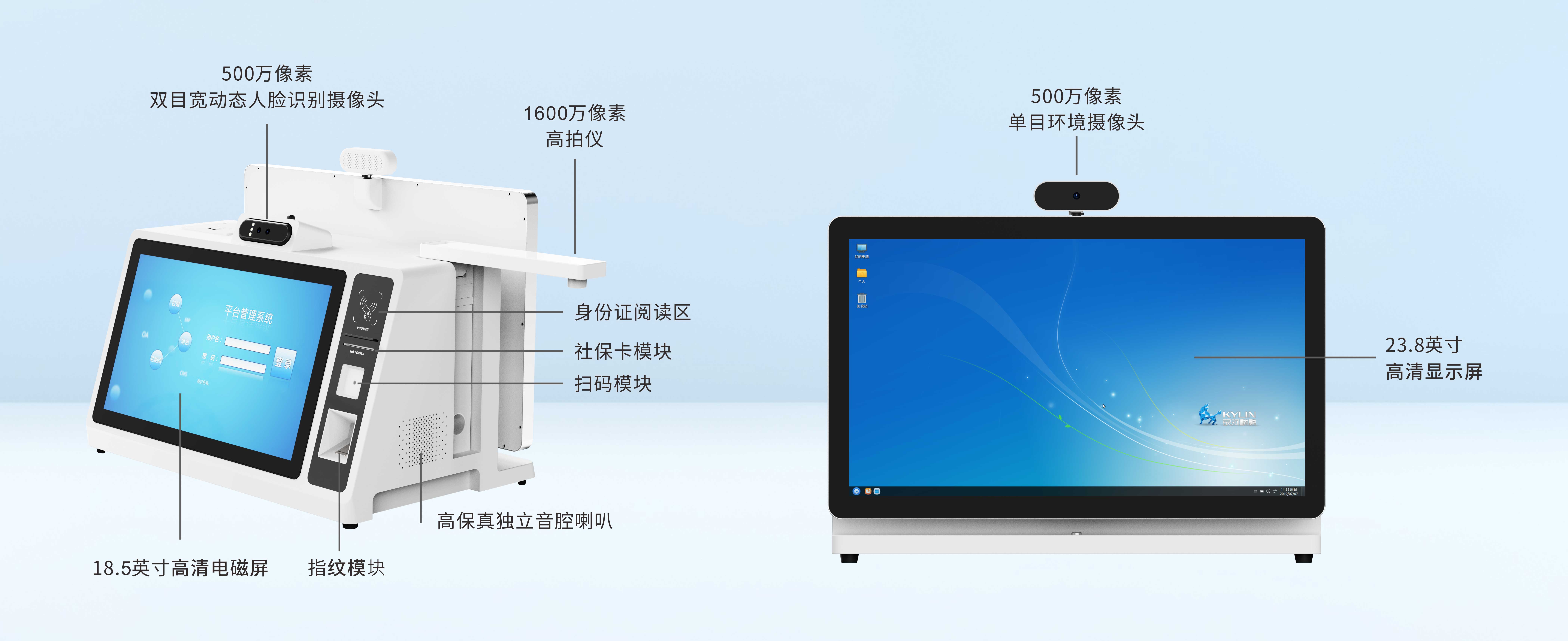 500+500万像素宽动态双目摄像头,支持人证比对、活体检测