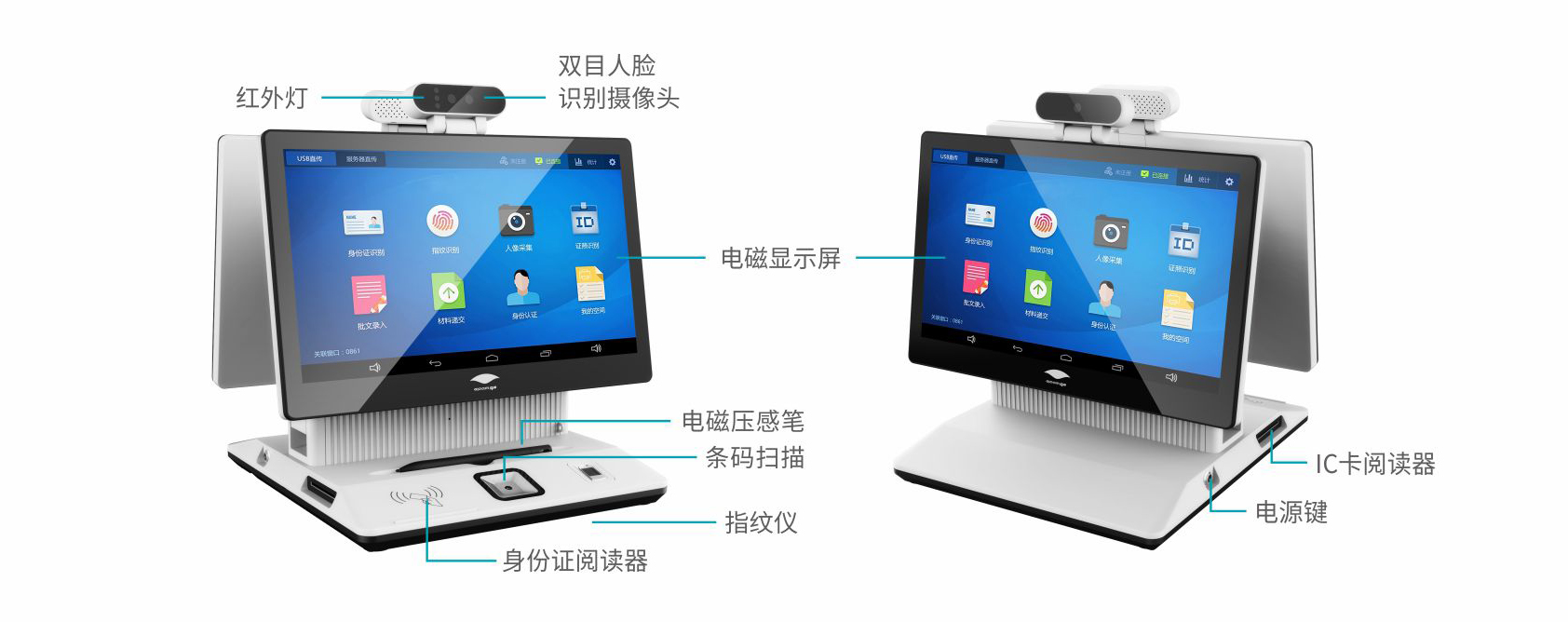 内置安卓11.0系统,支持HID功能,PC直连功能,集成信息交互、身份识别、指纹识别、人证比对、活体比对、人像拍照、文件扫描、签批评价、条码二维码扫描、打印功能、MIC、社保卡读取、多媒体广告等应用。