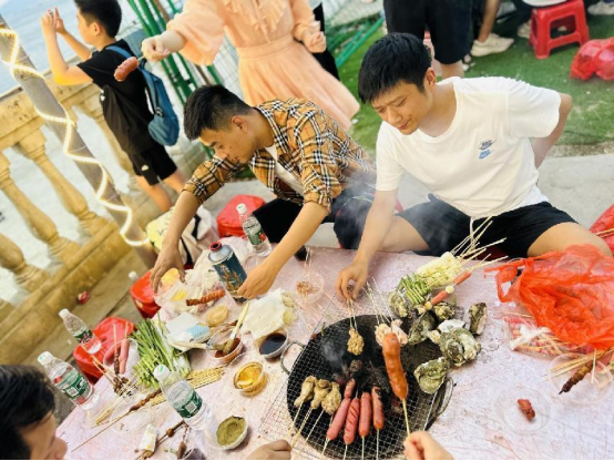 沙滩烧烤BBQ、露天KTV,大家一起围着喝酒、唱歌、聊天烧烤,其乐融融。尽情享受着团建旅行的热情和浪漫。