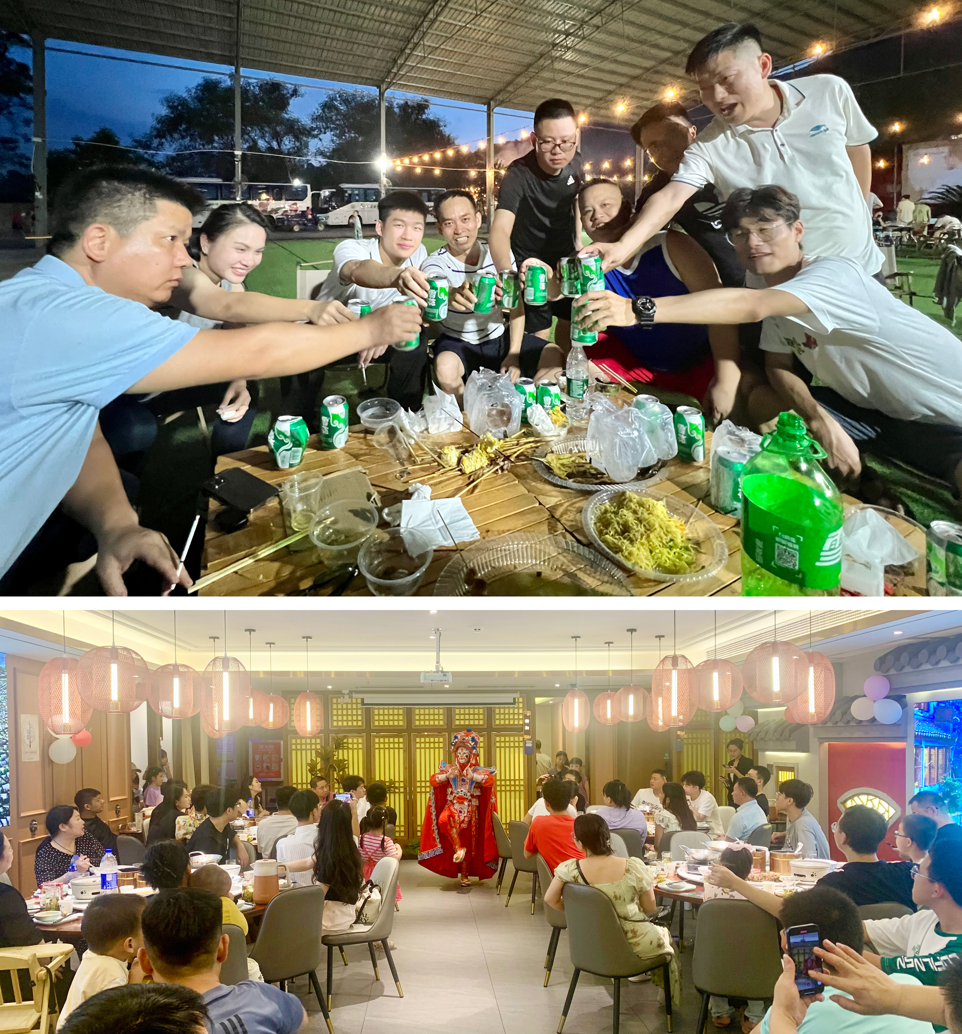 傍晚,幕天席地,融于自然,同事们亲自动手烧烤BBQ,来一场星空篝火狂欢,露天KTV,一起载歌载舞,做着各种趣味小游戏,其乐融融,尽情享受着团建旅行的热情和浪漫,享受难得的初秋惬意时光。