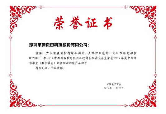 此外,大会组委会通过对新媒体全网舆情监测、大数据、云计算、社团推荐等多种形式,甄选出一批在互联网、物联网、人工智能领域中表现突出的企业和单位,予以表彰。其中,深圳市新良田科技股份有限公司自主研发生产的“良田书籍高拍仪BS2000P”,被授予“2019年度中国网信事业(数字政府)创新驱动示范产品”称号。